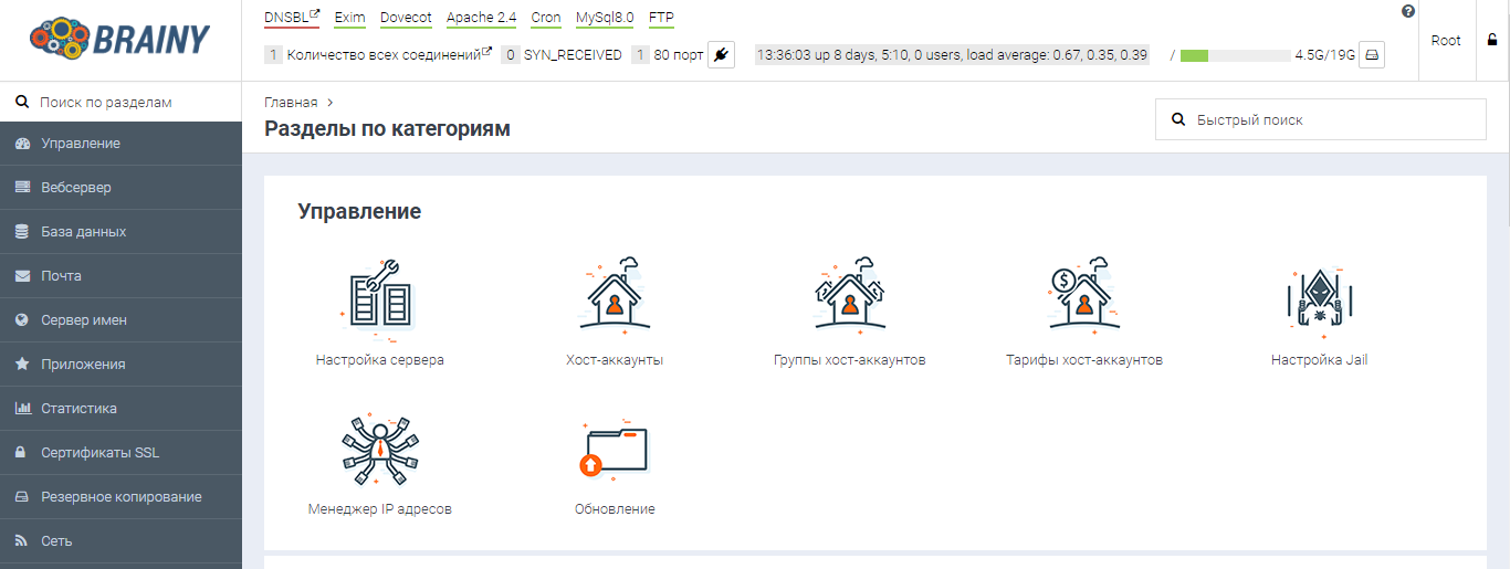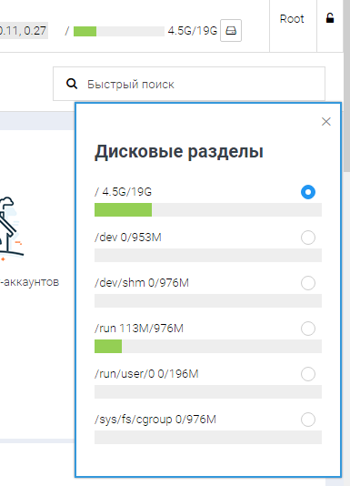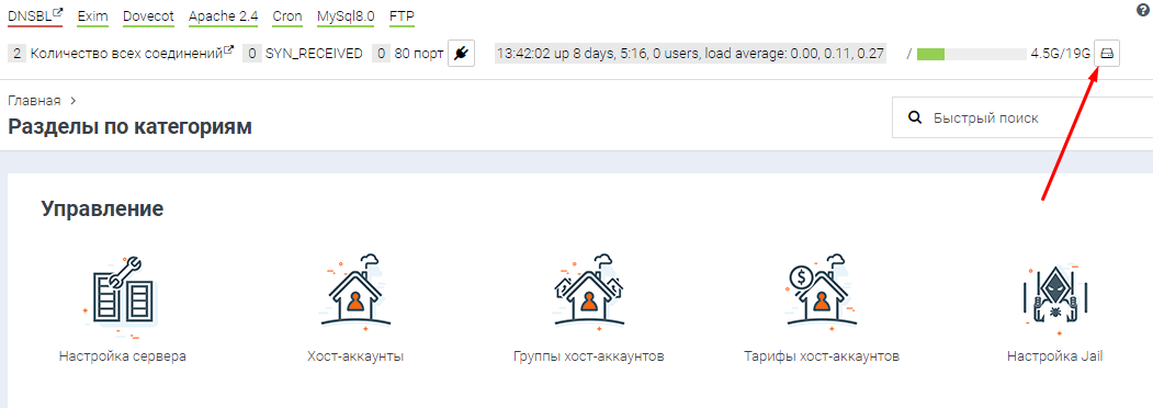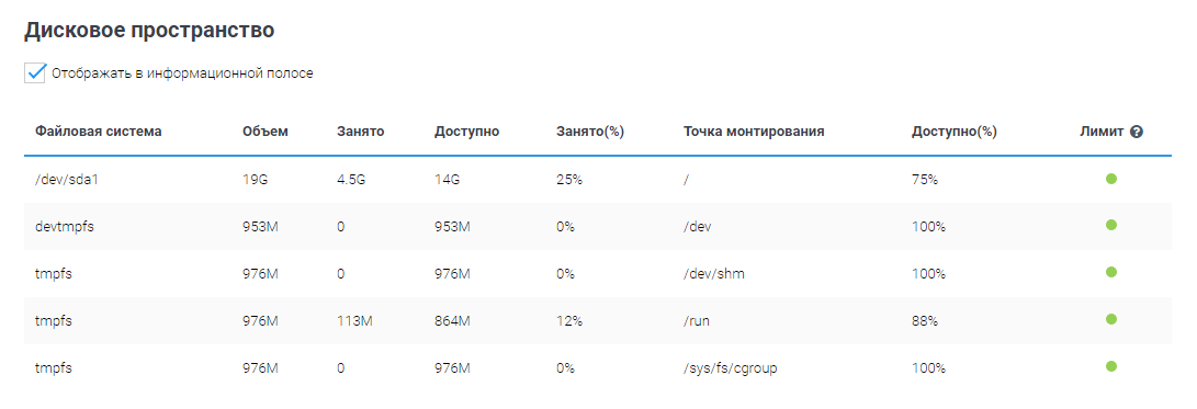В панели управления BrainyCP можно посмотреть информацию об использовании дискового пространства на сервере.