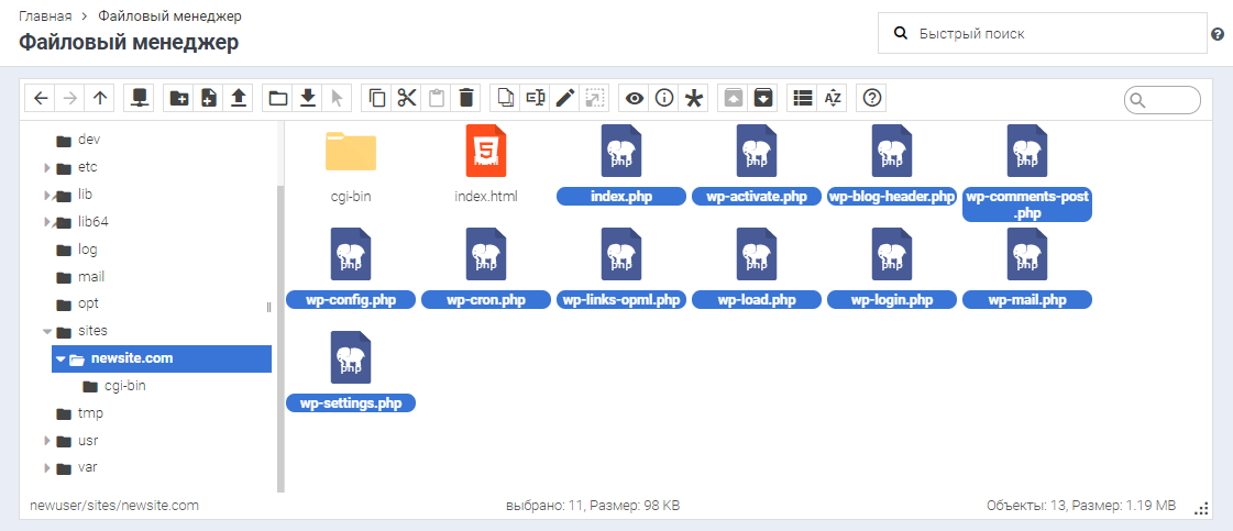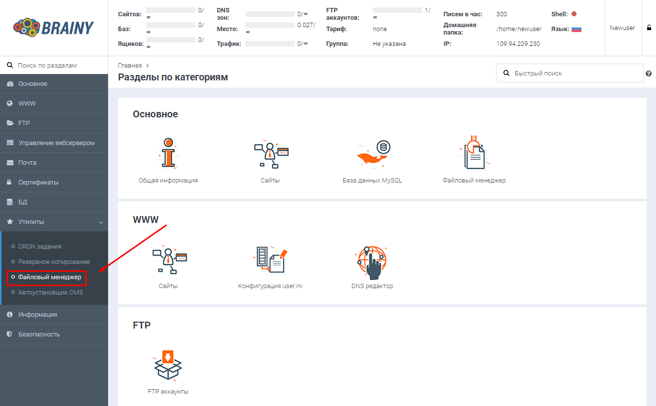 В панели управления BrainyCP можно загружать файлы прямо через встроенный файловый менеджер.