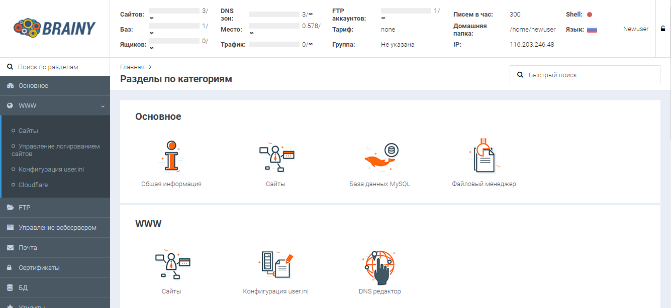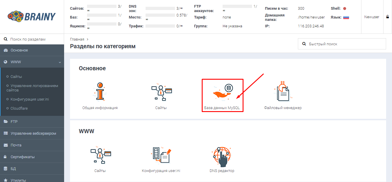 В панели управления BrainyCP можно создать базу данных для сайта.