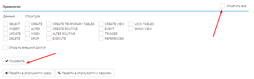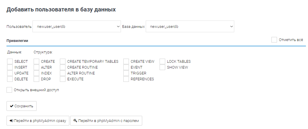 Выдайте права (рекомендуется выбрать Отметить все) и нажмите Сохранить: