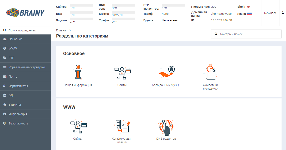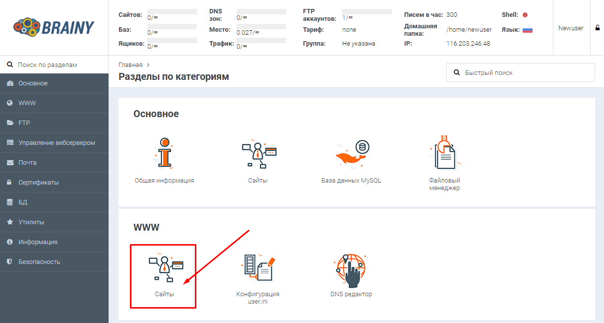 Войдите в панель управления BrainyCP под пользователем, в аккаунте которого будет работать сайт: