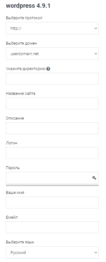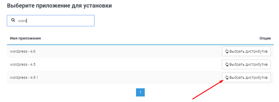Найдите нужную CMS (например, WordPress) и нажмите Выбрать дистрибутив: