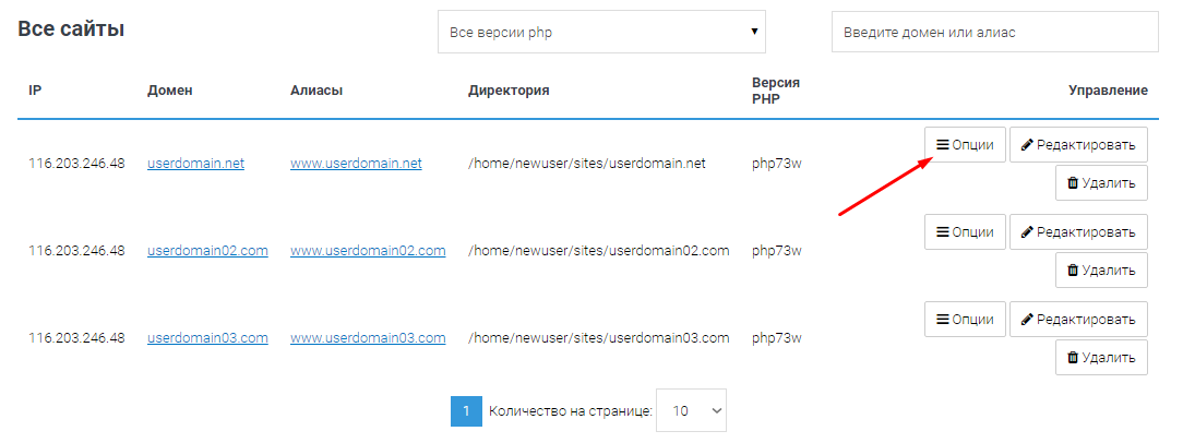Выберите нужный домен и нажмите Опции:
