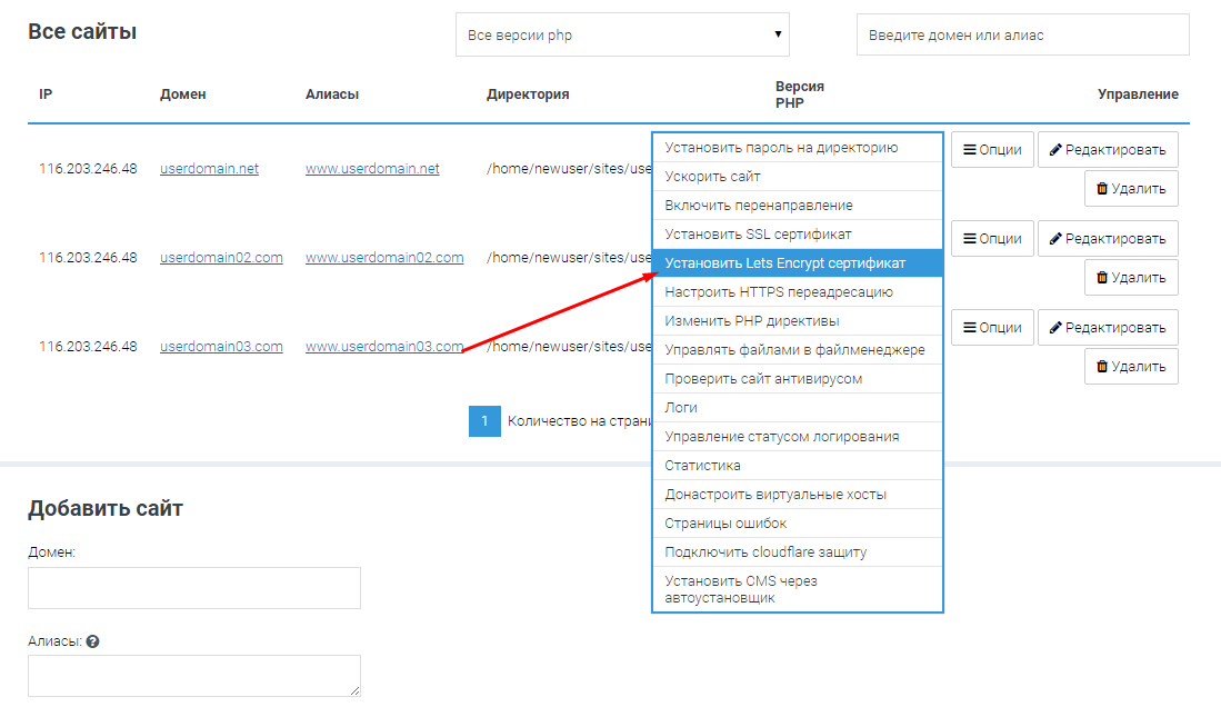 Выберите пункт Установить Lets Encrypt сертификат: