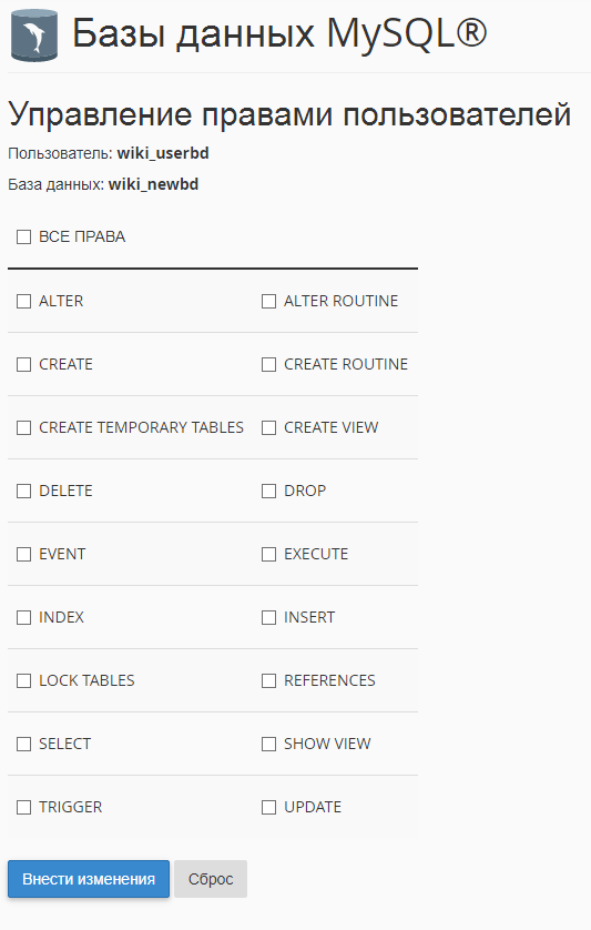 Назначьте права (рекомендуется выбрать ВСЕ ПРАВА) и сохраните изменения.