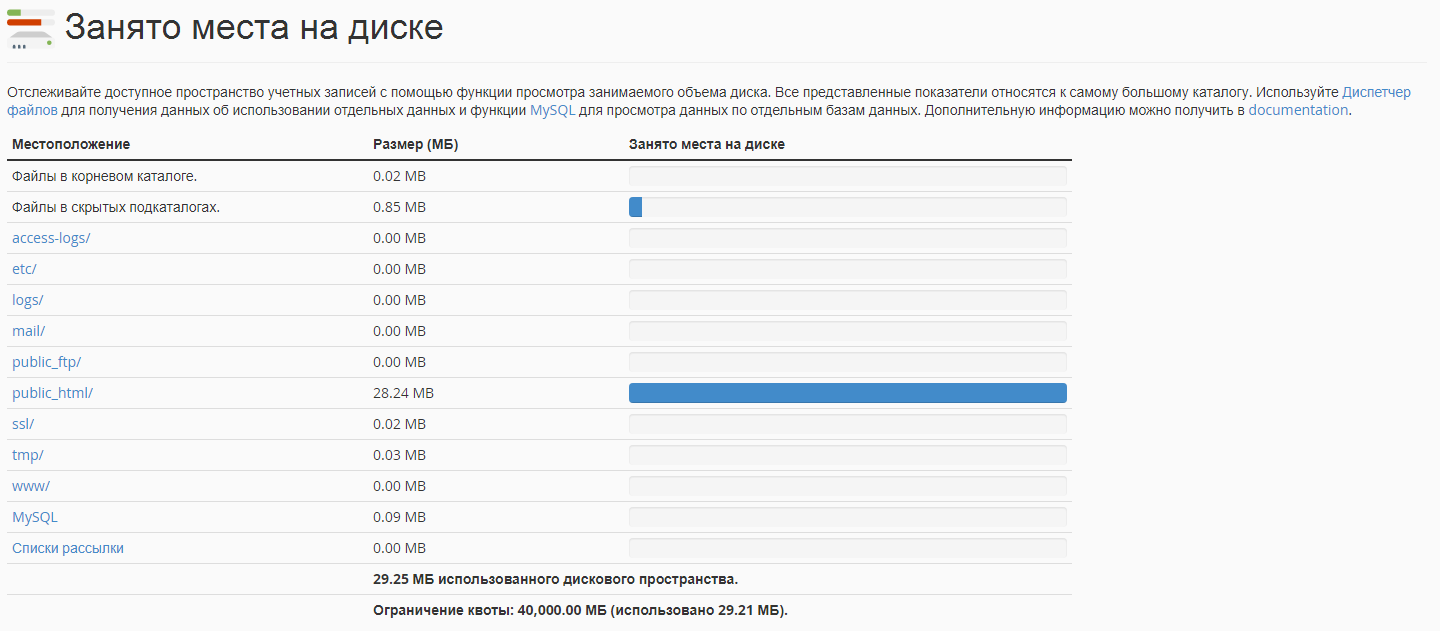В cPanel можно быстро узнать, сколько дискового пространства занимает ваш аккаунт и какие папки используют больше всего места.