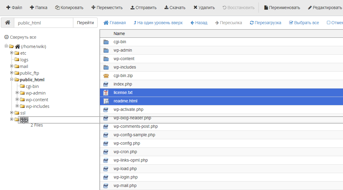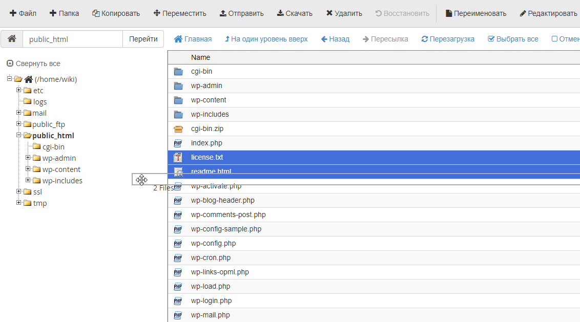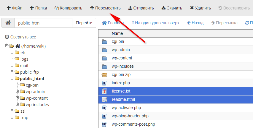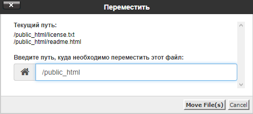 Менеджер файлов в cPanel: перемещение файлов и папок