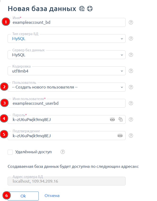 | Удалённый доступ | Позволяет подключаться к базе данных извне. Используйте при необходимости. |