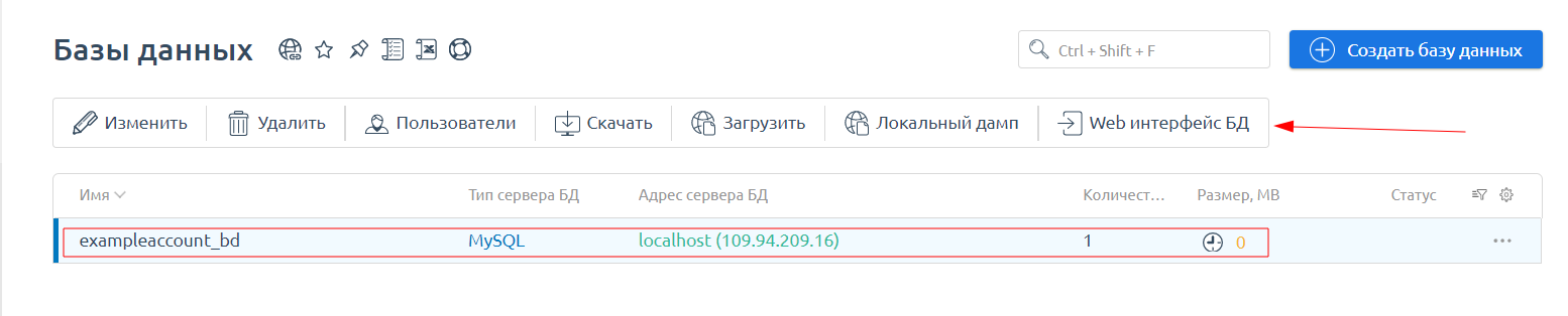 Для перехода в phpMyAdmin выберите созданную базу данных и нажмите Web интерфейс БД.