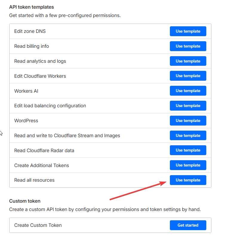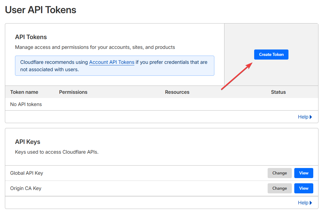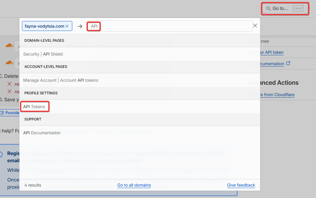 В Cloudflare перейдите в раздел API Tokens (через поиск).