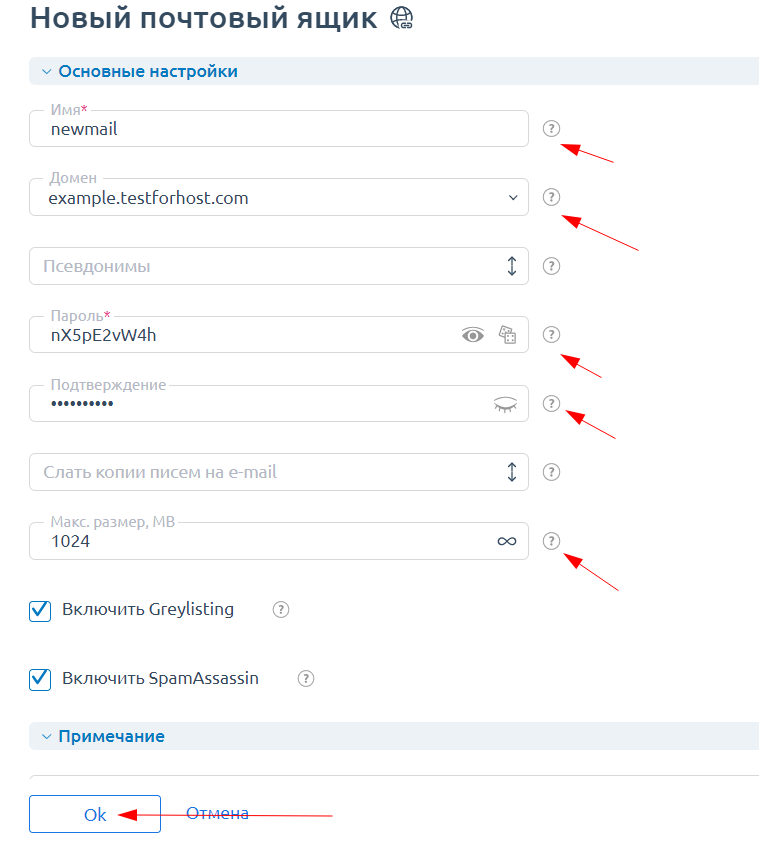 В поле Пароль укажите или сгенерируйте пароль для почтового ящика и не забудьте подтвердить его в поле Подтверждение.