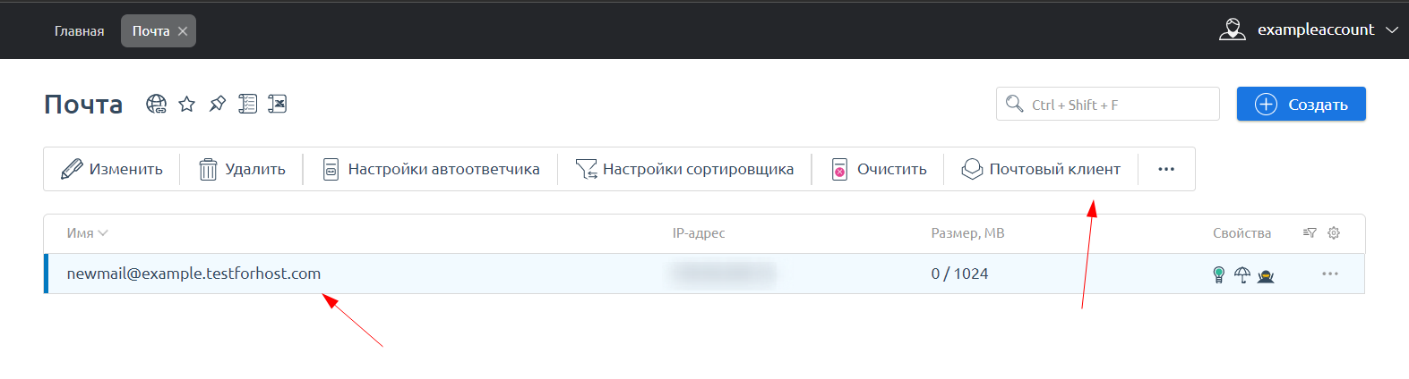 В Вашей панели управления перейдите в раздел Почта / Почтовые ящики, нажмите на кнопку Создать.