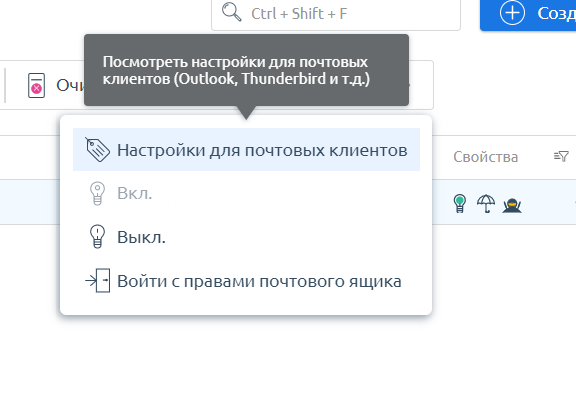 Для настройки почтового ящика в программах Mozilla Thunderbird, TheBat, Outlook и других Вы можете получить все необходимые настройки, нажав на кнопку Настройки для почтовых клиентов.