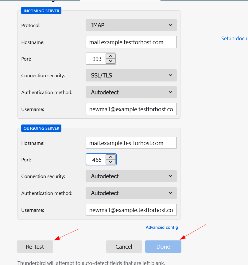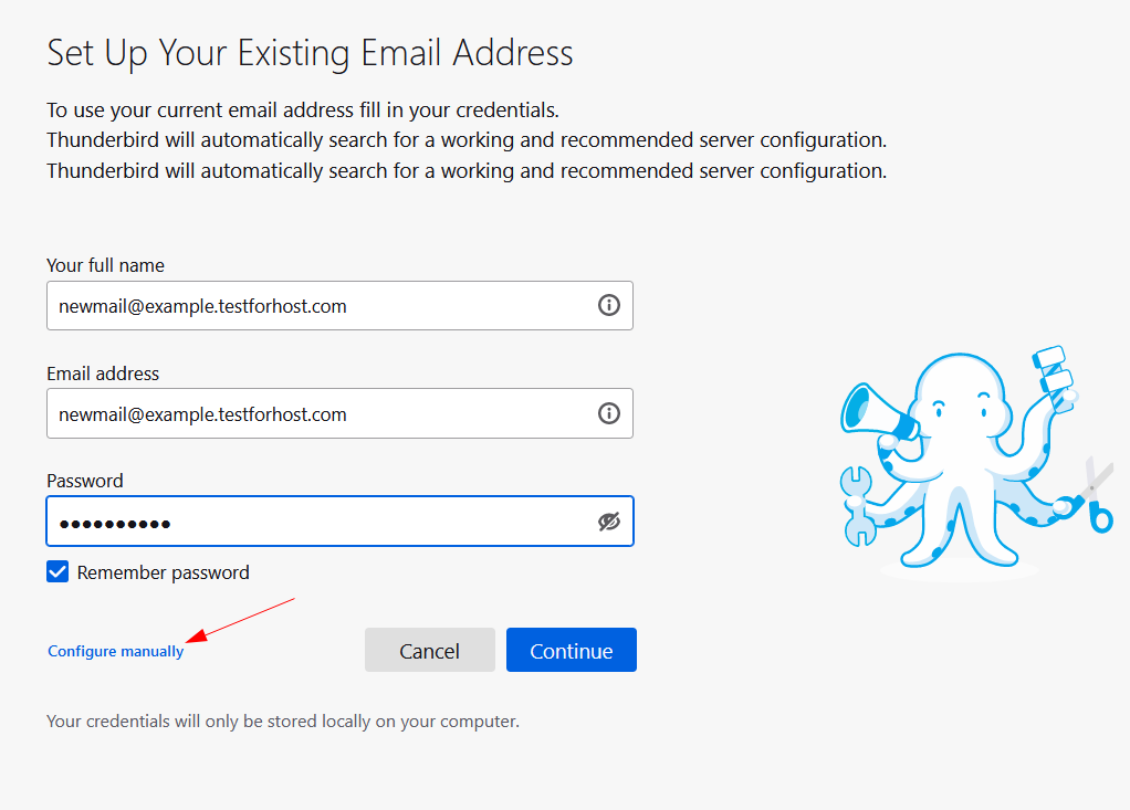 Например, для Mozilla Thunderbird необходимо ввести данные почтового ящика и выбрать ручную установку.