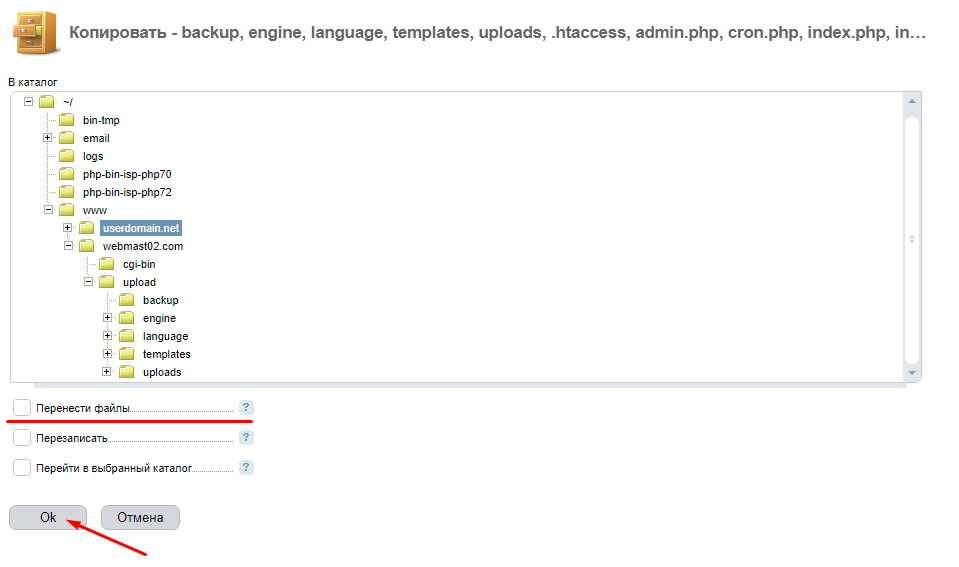 Выберите папку назначения. Если требуется перемещение файлов, установите опцию Перенести файлы, затем нажмите Ок.
