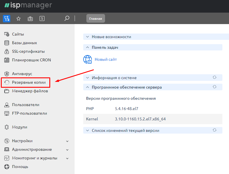 Для настройки резервного копирования перейдите в раздел Резервные копии в панели управления ISPmanager.
