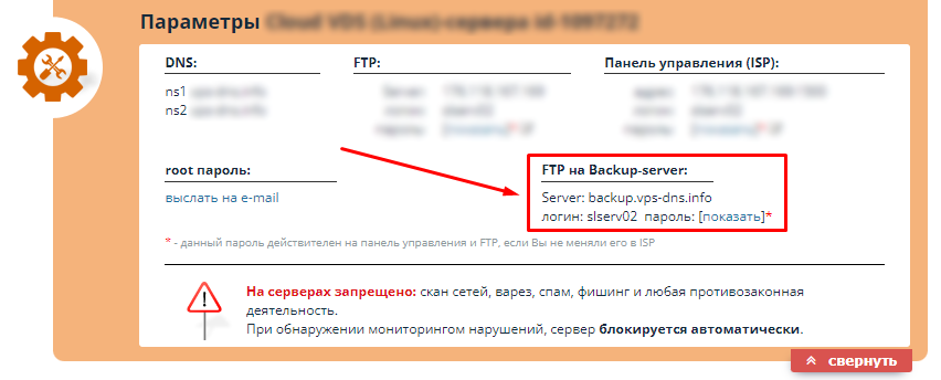 Для каждого VPS предоставляется отдельный FTP-аккаунт для хранения резервных копий.