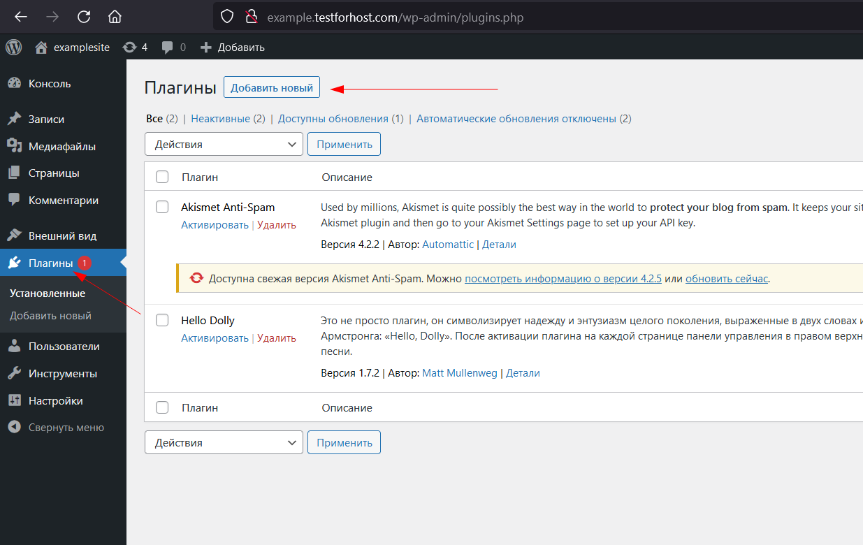 Войдите в админ-панель WordPress и перейдите в раздел Плагины → Добавить новый.