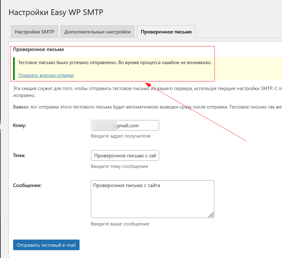 Если всё настроено правильно, вы увидите сообщение об успешной отправке письма.