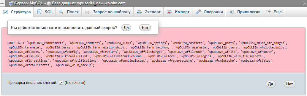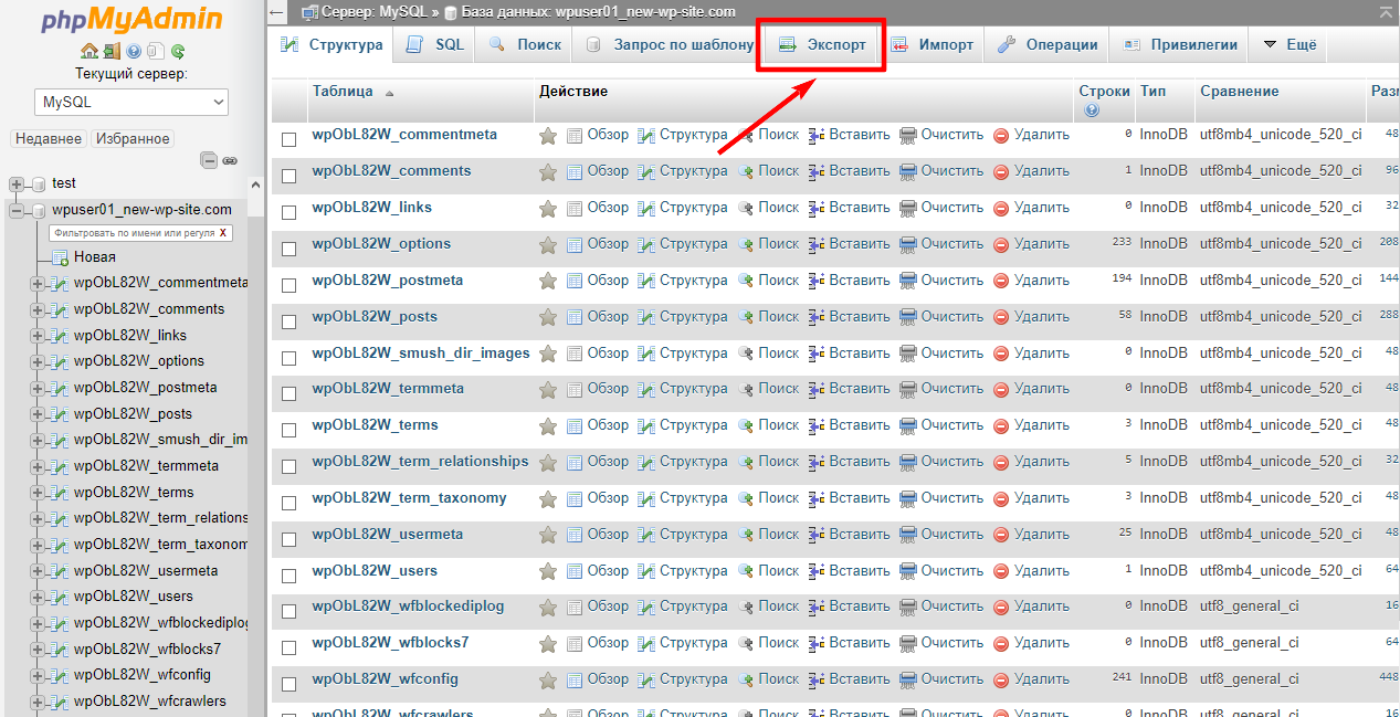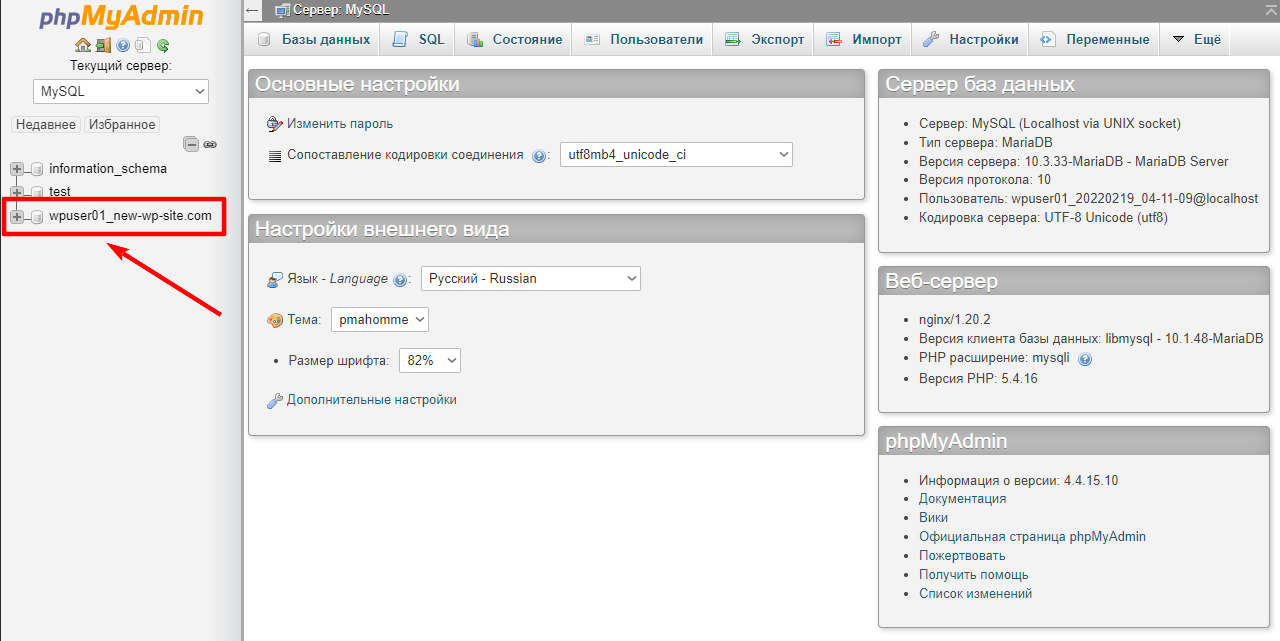 Для устранения данной проблемы войдите в phpMyAdmin в Вашей панели управления и на боковой панели нажмите на имя Базы Данных Вашего сайта: