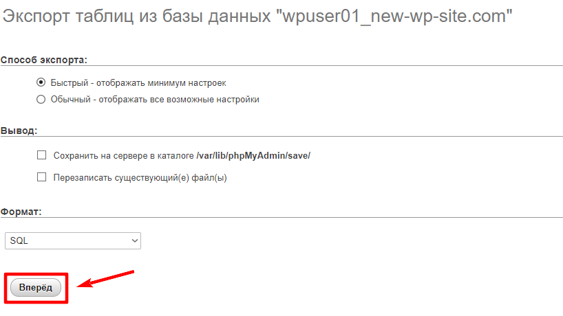 Нажмите на кнопку Вперед и дождитесь окончания скачивания файла *.sql: