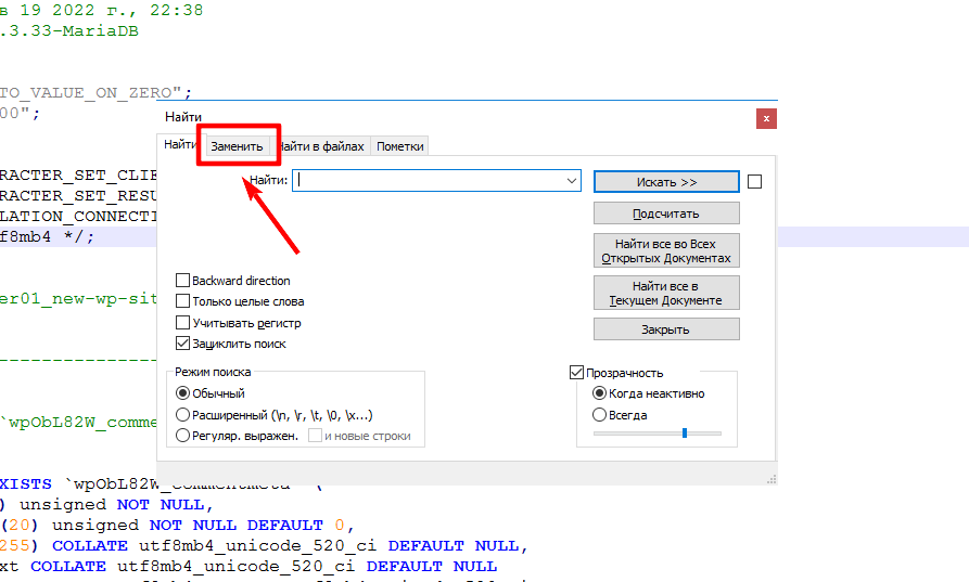 В программе Notepad++ нажмите комбинацию клавиш ctrl+f и в появившемся окне перейдите во вкладку Заменить:
