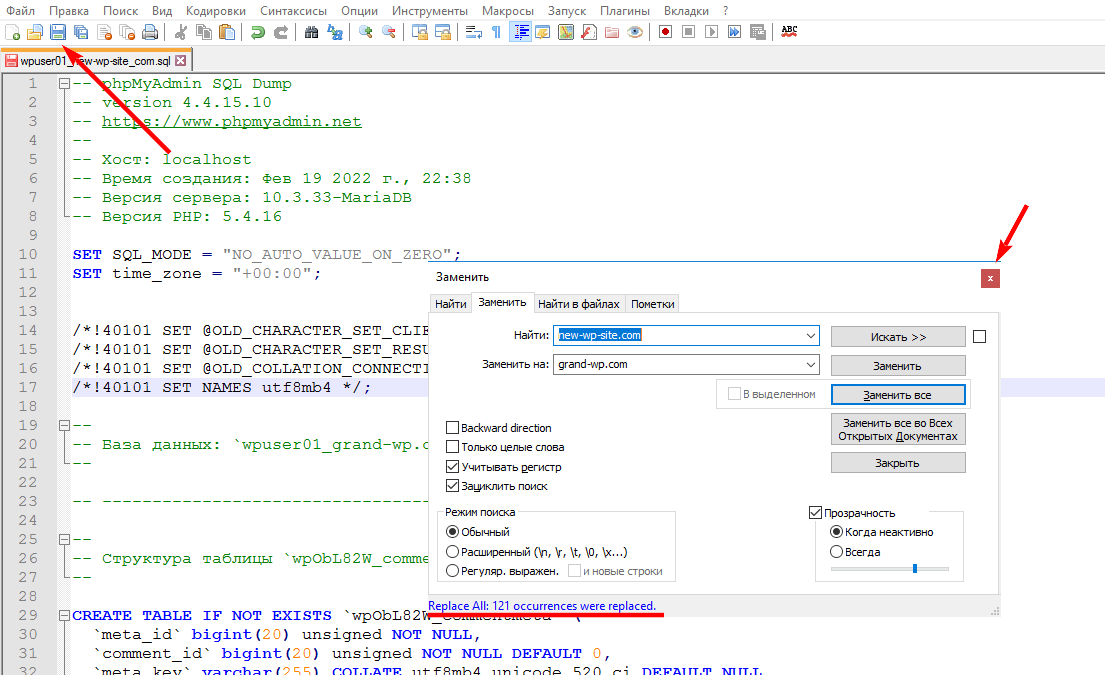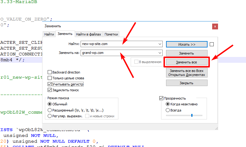 В поле Найти нужно указать имя текущего домена Вашего сайта, а в поле Заменить на требуется указать новое доменное имя, после чего нажать на кнопку Заменить все: