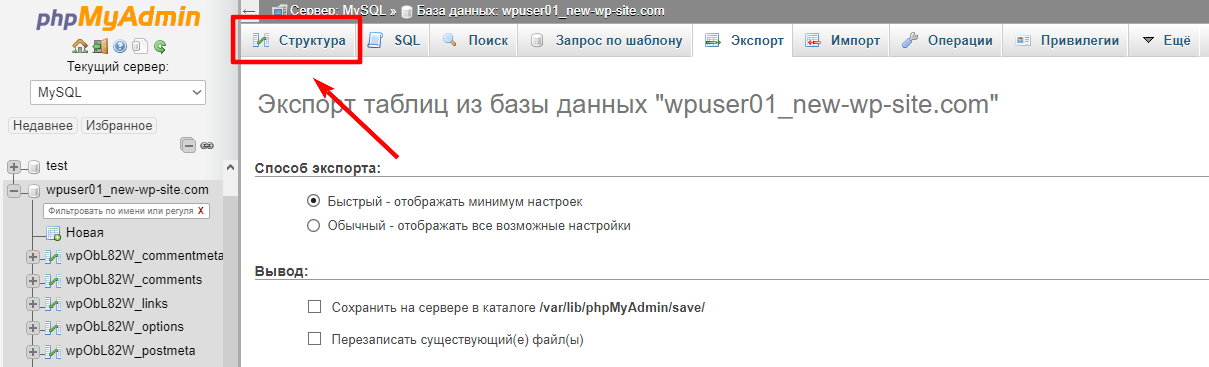 Возвращаемся в phpMyAdmin, и переходим во вкладку Структура: