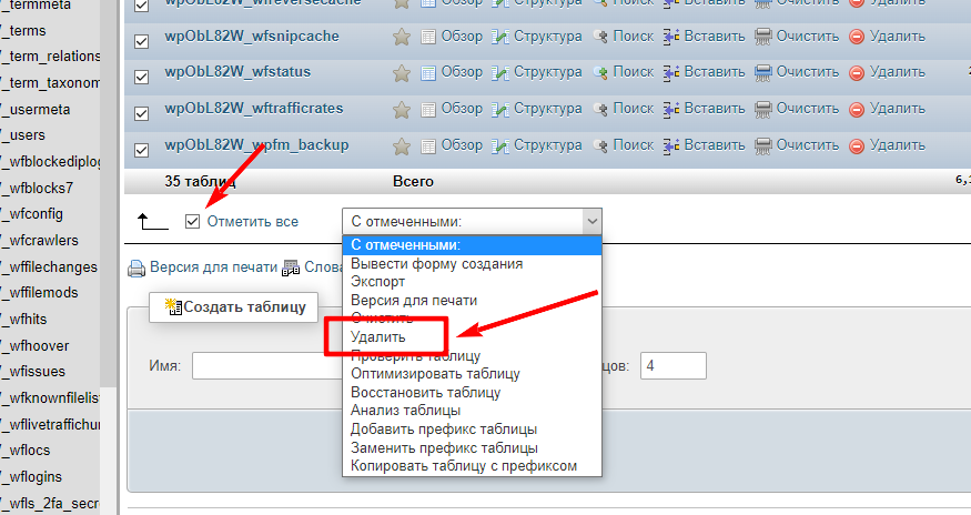 Нам нужно очистить Базу Данных, для того чтобы залить новые данные. Для этого внизу страницы нажимаем на Отметить все и в выпадающем меню выбираем пункт Удалить: