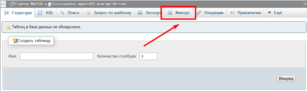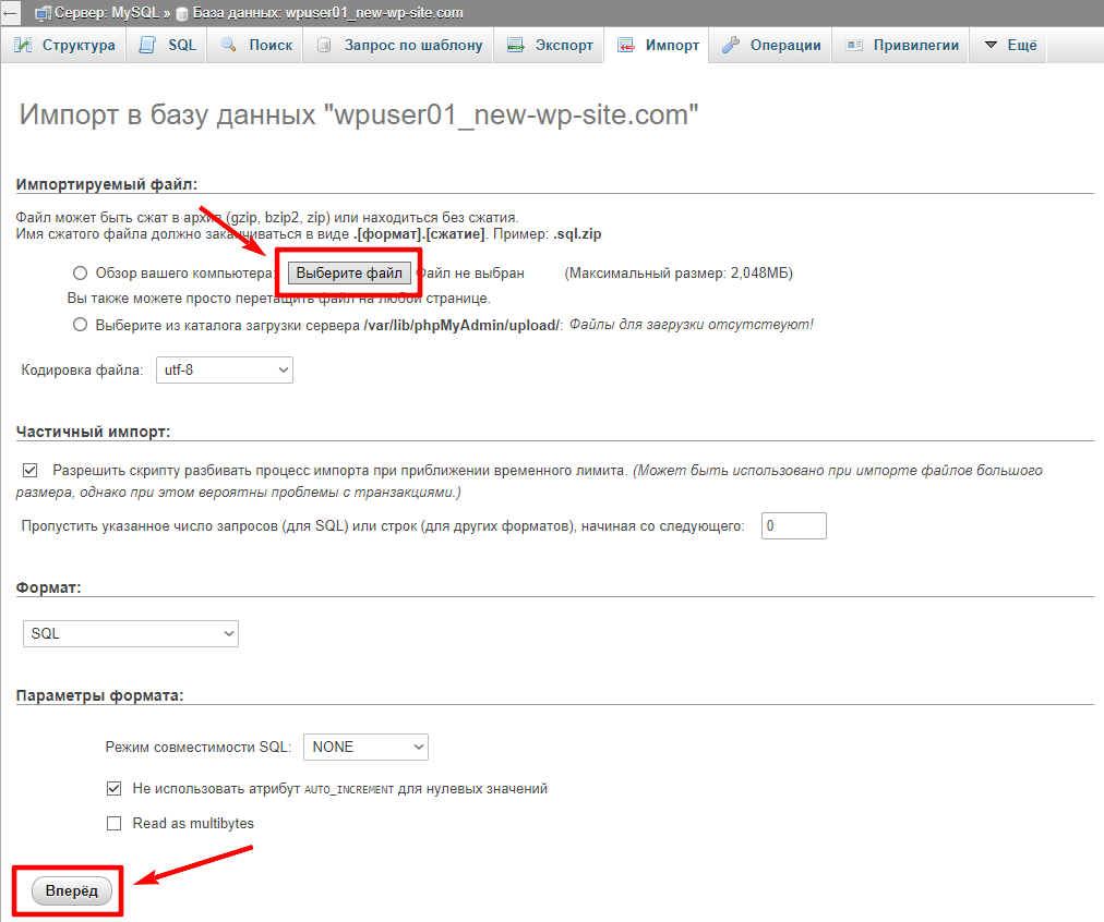 Загрузите отредактированный файл *.sql нажав на кнопку Выберите файл и нажмите на кнопку Вперед: