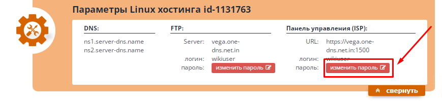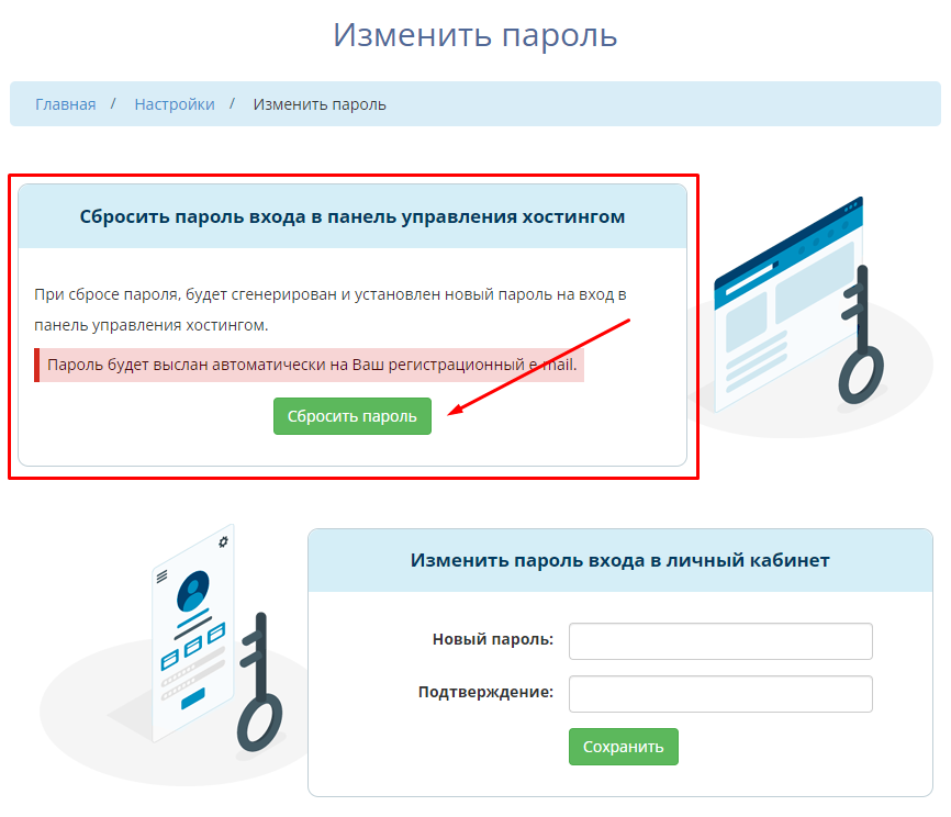 В разделе Изменить пароль используйте форму Изменить пароль входа в панель управления хостингом и нажмите кнопку Сбросить пароль.