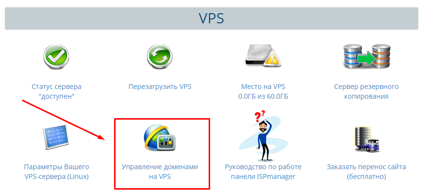 Для этого перейдите в личный кабинет в раздел Управление доменами на VPS: