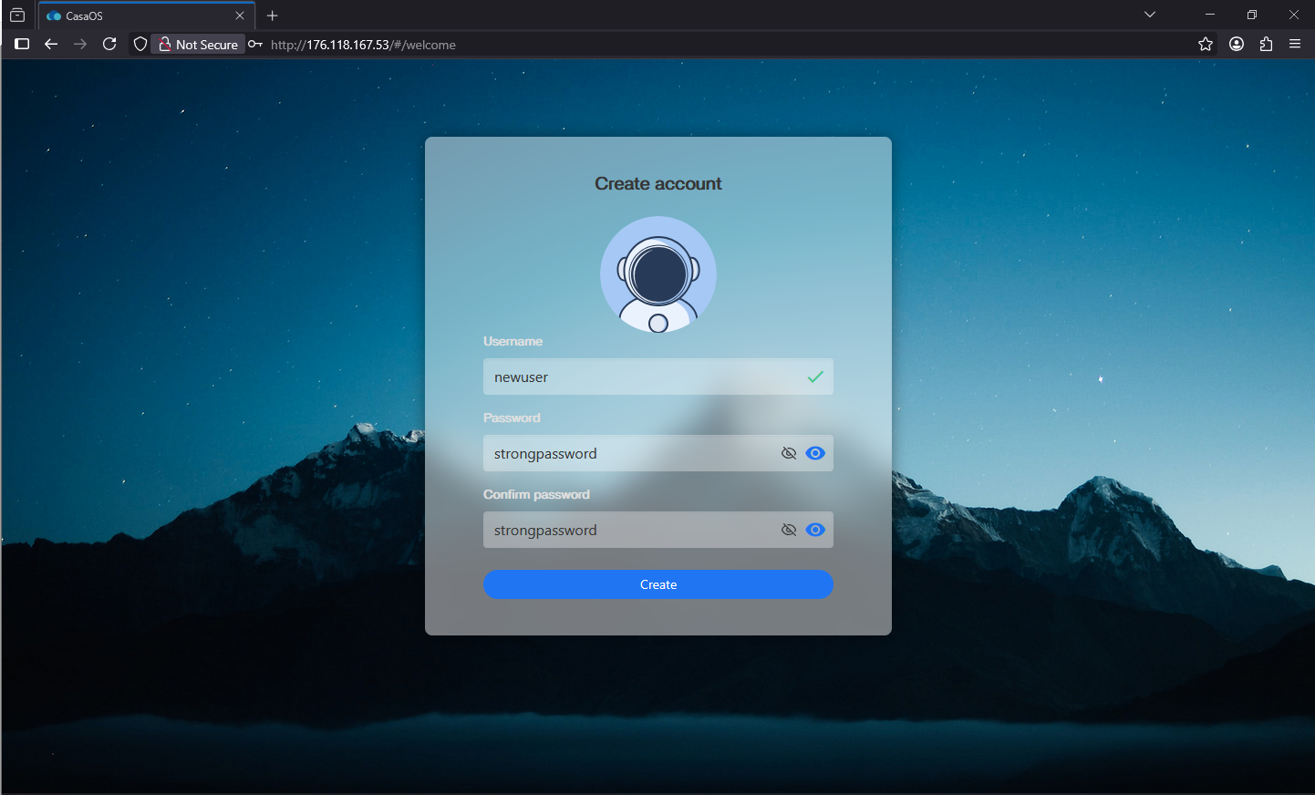 Введите имя пользователя и сложный пароль (дважды) для регистрации в рабочем пространстве и нажмите кнопку Создать.