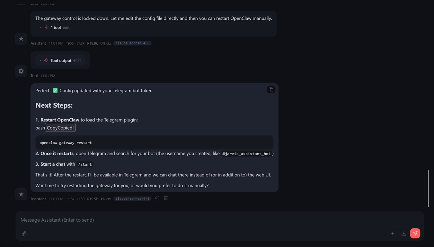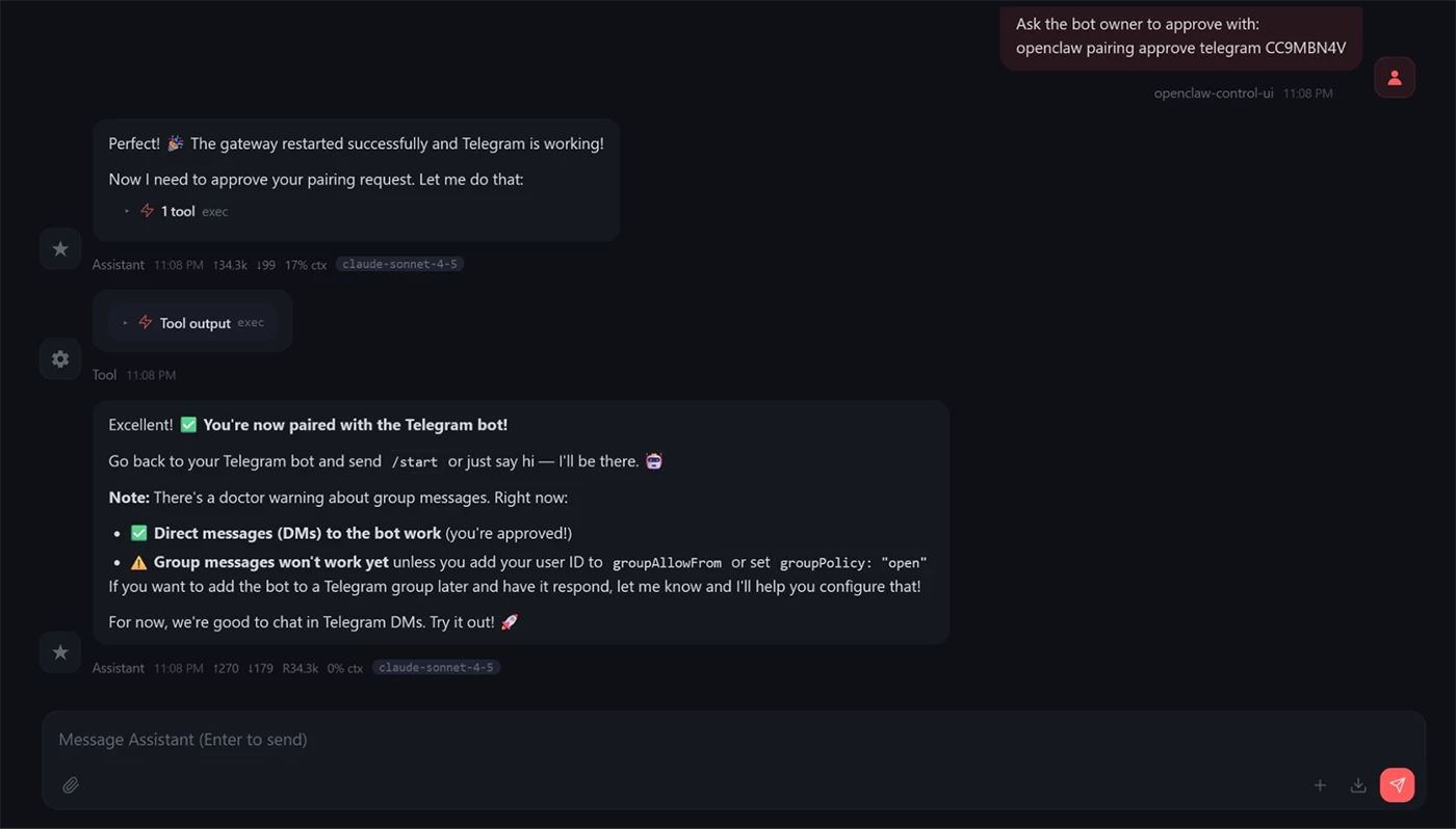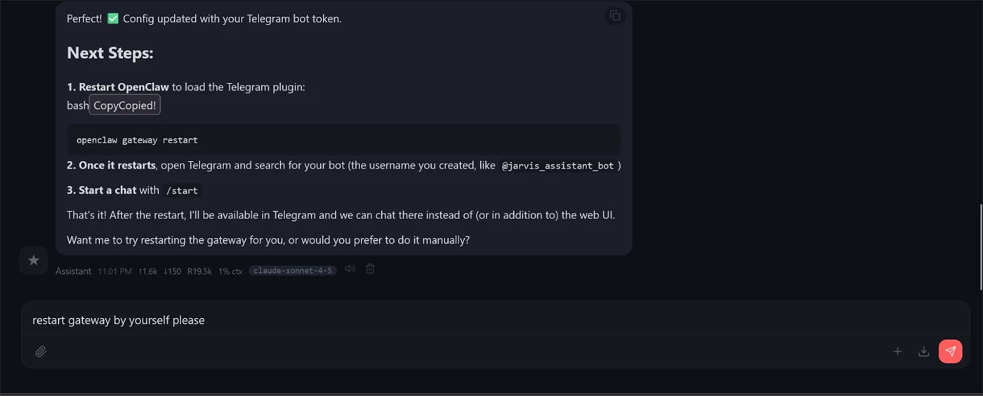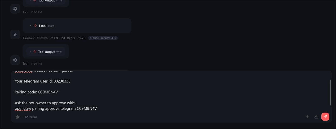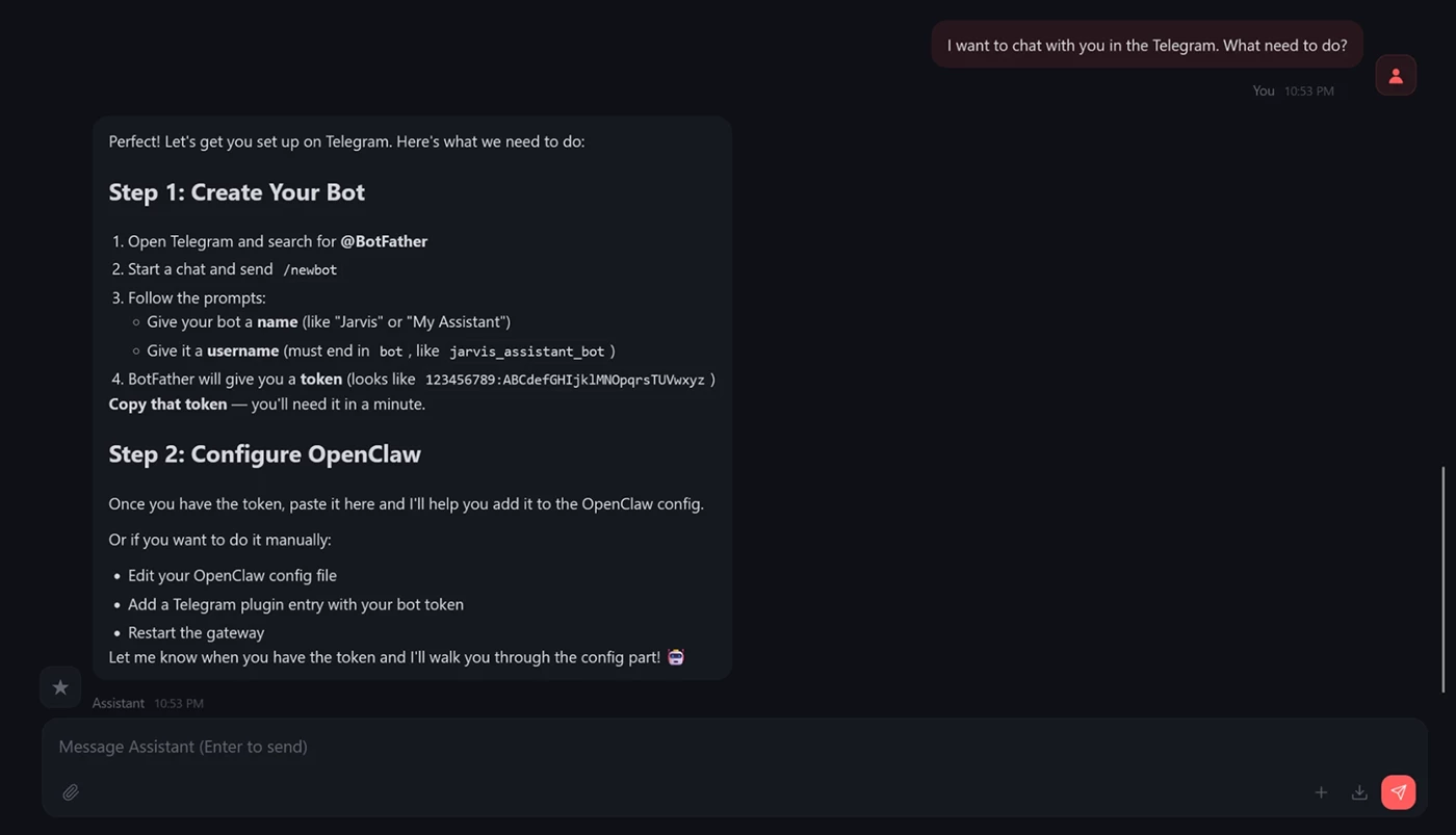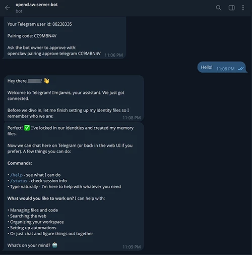 OpenClaw поддерживает интеграцию с Telegram. Сообщите агенту, что хотите подключить его к Telegram, и следуйте дальнейшим подсказкам.