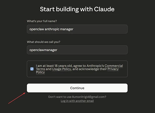 Заполните базовую информацию, подтвердите принятие правил использования и нажмите Continue.