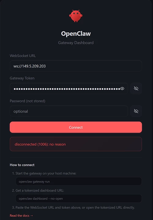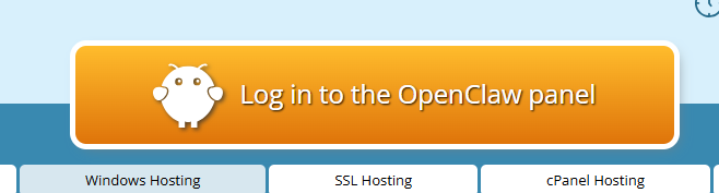 Для начала работы перейдите в личный кабинет и нажмите кнопку Log in to the OpenClaw panel.