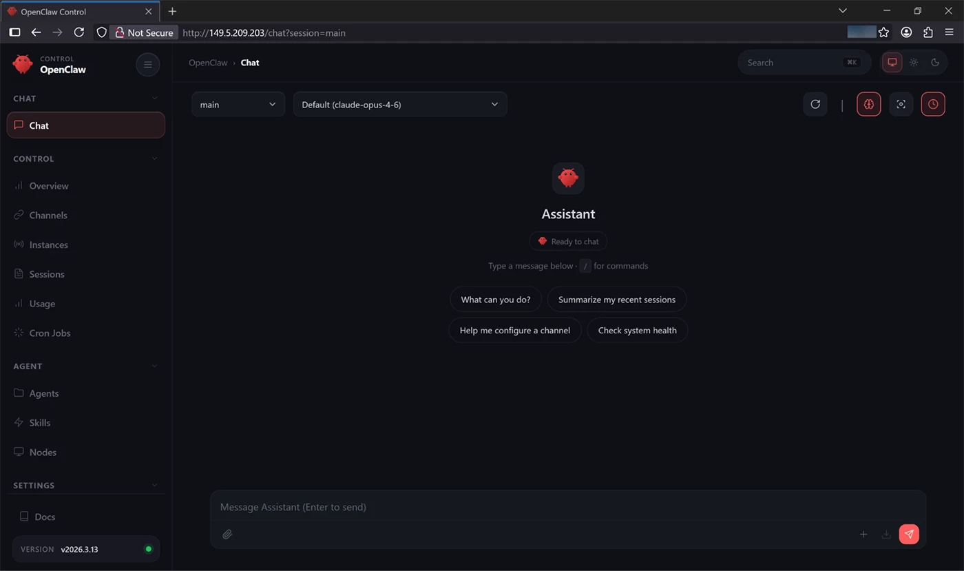 После входа откроется панель OpenClaw. Ваш персональный AI-ассистент уже запущен и работает, однако его необходимо настроить для работы с AI-платформой.