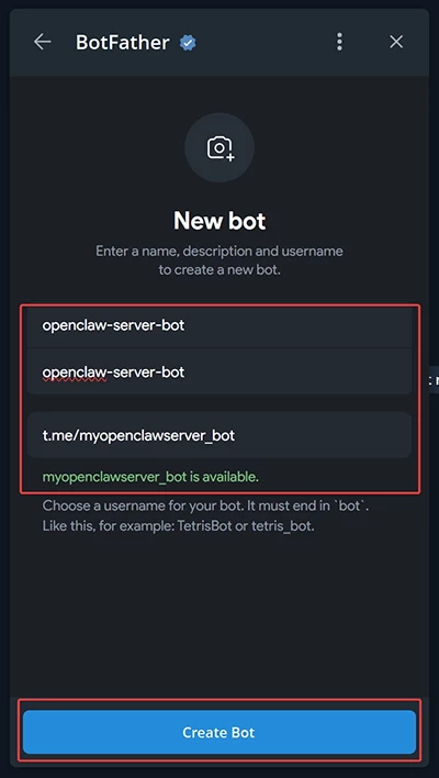 Укажите имя, описание и username бота. Убедитесь, что username уникален.