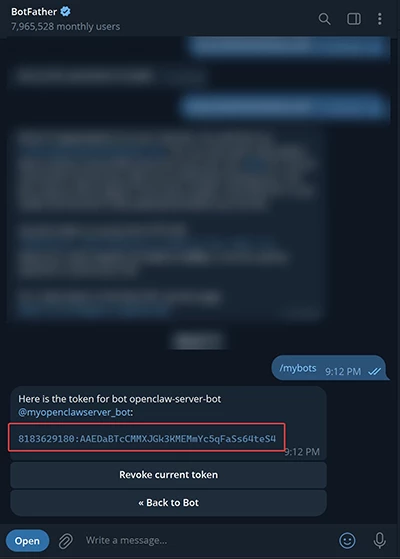 Скопируйте API-токен Telegram-бота и отправьте его в чат OpenClaw.