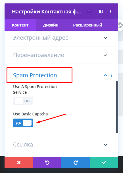По умолчанию включена защита от спама (Captcha). При необходимости ее можно изменить в разделе Spam Protection:
