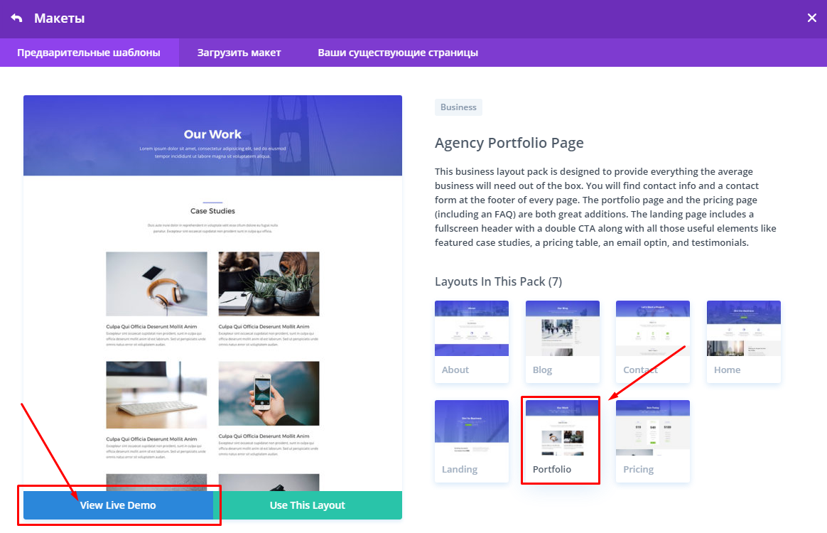 Для каждого шаблона доступен предварительный просмотр. Для этого нажмите View Live Demo: