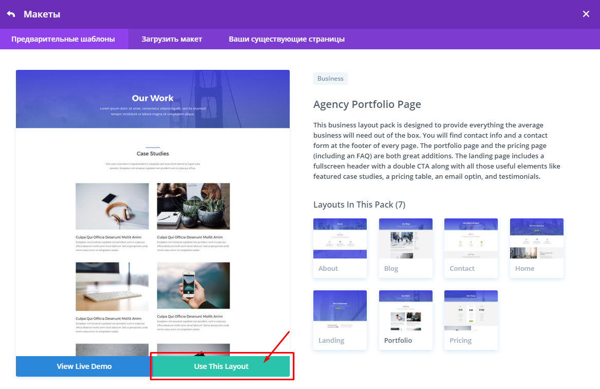 Чтобы использовать выбранный макет, нажмите Use This Layout: