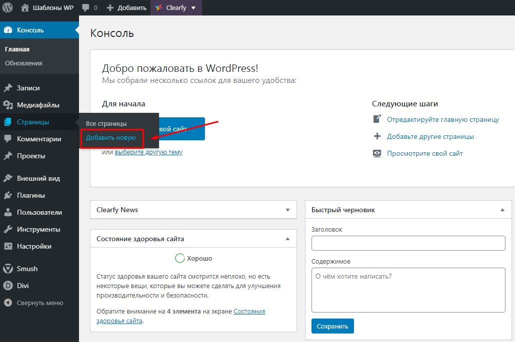 Перейдите в раздел Страницы / Добавить новую: