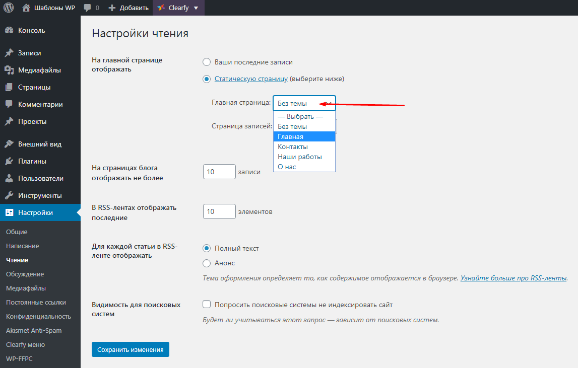 В разделе Главная страница выберите страницу, которую необходимо назначить главной: