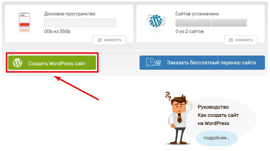 Для создания сайта на тестовом домене нажмите кнопку «Создать WordPress сайт» в разделе «Мои WordPress сайты»: